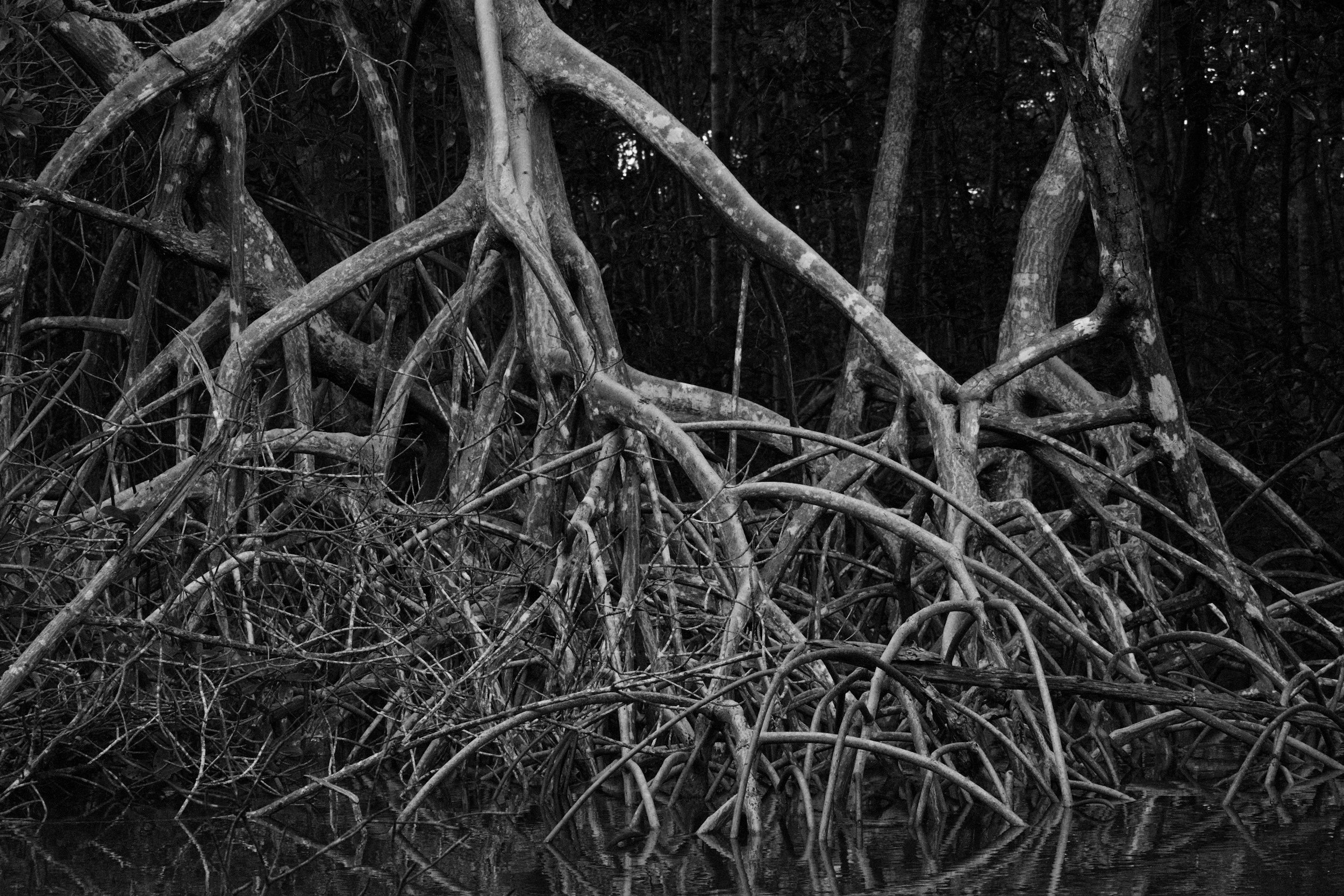 Los manglares prosperan tanto en agua dulce como salada, avanzando tierra adentro a través de cuencas fluviales: las venas que sostienen la vida archipelágica. Están abiertos a la relación pero al mismo tiempo actúan como barreras que protegen los ecosistemas costeros. El manglar desestabiliza las formas lineales de la historia mediante el potencial generativo del enredo y los orígenes poco claros. A medida que las raíces se entrelazan y los árboles del manglar se mezclan, el bosque se conecta mediante caminos submarinos que resuenan hasta el Pasaje Intermedio, sin embargo se mantienen enraizados en las aguas costeras, enlazando islas y personas y recordándonos de cómo “la unidad es submarina” (Brathwaite, 1973). Los rizomas, así como la marea, nunca claro dónde comienzan ni dónde acaban, forjan la historia caribeña desde la dislocación y el trauma para que así podamos cruzar hacia un futuro en relación lleno de “crecimiento cultural complejo que es expresado a través de prácticas críticas de indigenización…reposicionando, resistiendo y realojando” (Crichlow and Northover 2012, 225). Nuestros pies se hunden cada vez más en el babote, el suelo cercano a la orilla que es siempre poroso, turbio, opaco y nunca firme, cediendo ante quienes se atrevan a cruzarla sin la certeza de saber dónde aterrizará cada paso. El peso de la historia, la opacidad y los orígenes inciertos nos hunden aún más en el babote, mientras luchamos por encontrar nuestro equilibrio; sin embargo, al aferrarnos al manglar, quizás podamos abrazar formas relacionales de herencia que, a la vez, están arraigadas en el paisaje caribeño (Glissant, 1997; CENTRO, Rooted + Relational).